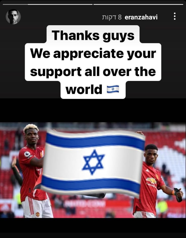 ערן זהבי גרר תגובות נזעמות מגולשים לאחר שהחליף את דגל פלסטין בדגל ישראל וכתב תודה על תמיכתכם בתמונות שתיעדו שחקנים בולטים, כמו פול פוגבה ערן זהבי. אדינסון קבאני הבקיע שער גדול .